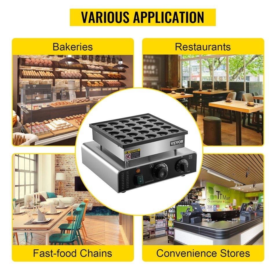 Perfect for Various Uses & Places: With a compact size of 13.4"x12.6"x7.1" (340x320x180 mm), our poffertjes machine is capable of baking resembling small and fluffy pancakes in heart shapes, 25 pieces each time. You can decorate them with fruits and add extra flavors by sprinkling syrup, butter, whipped cream, powdered sugar, etc. It perfectly fits an open kitchen of various places, including but not limited to bakeries, cafés, cold drink shops, fast-food chains, canteens, and restaurants.